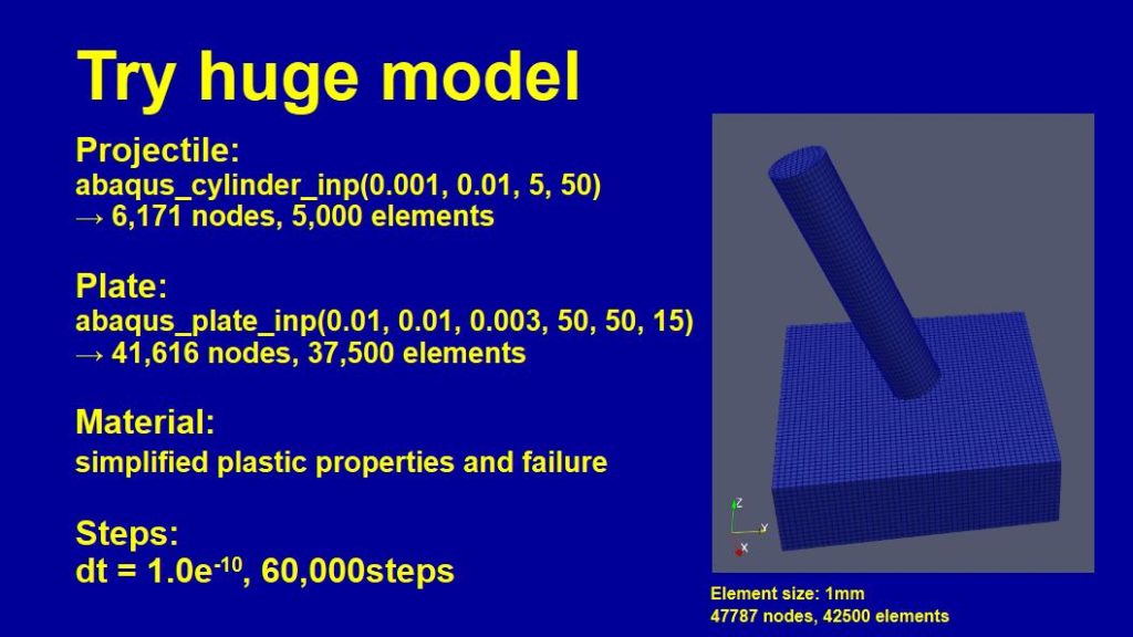 これでモデルの節点と要素のデータはそろったので、あとは他の解析条件(材料特性、初期速度、境界条件、時間ステップなど)を手動で入力してAbaqusのinpファイルを作成する事ができます。