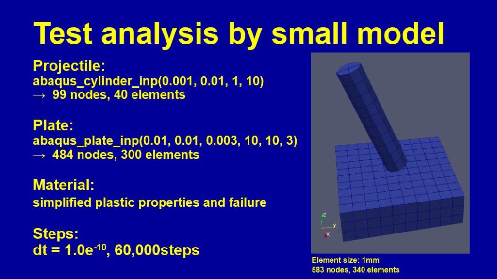 これでモデルの節点と要素のデータはそろったので、あとは他の解析条件(材料特性、初期速度、境界条件、時間ステップなど)を手動で入力してAbaqusのinpファイルを作成する事ができます。